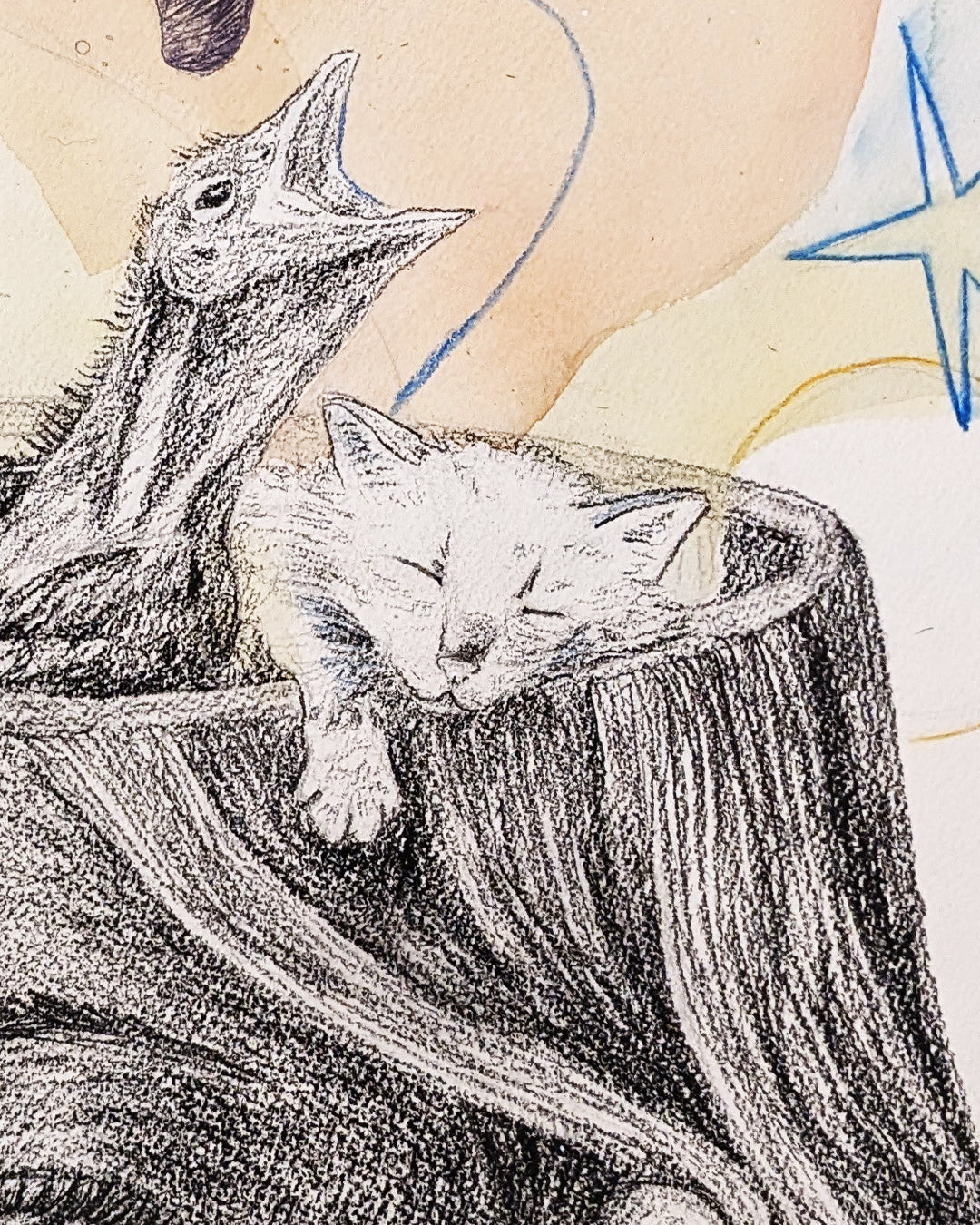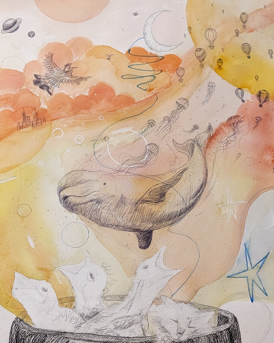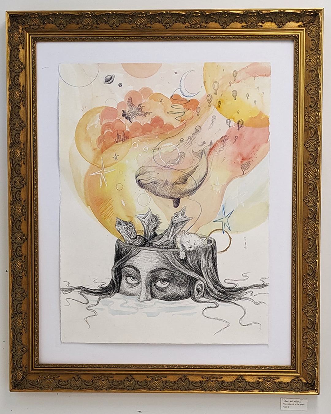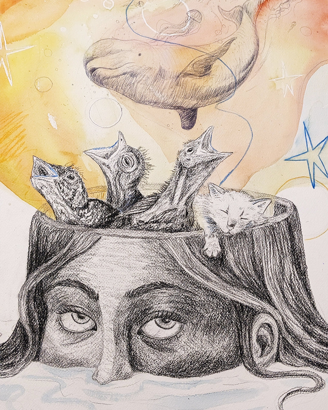 This mixxmedia painting was inspired by some lyrics "Ceux qui rêvent ont ien de la chance, et les autres ont des insomnies". In between dreams and insomnia, a whole world is created during nighttime, whether we are still awake with a lack of sleep or dreaming. The mind is amazing!