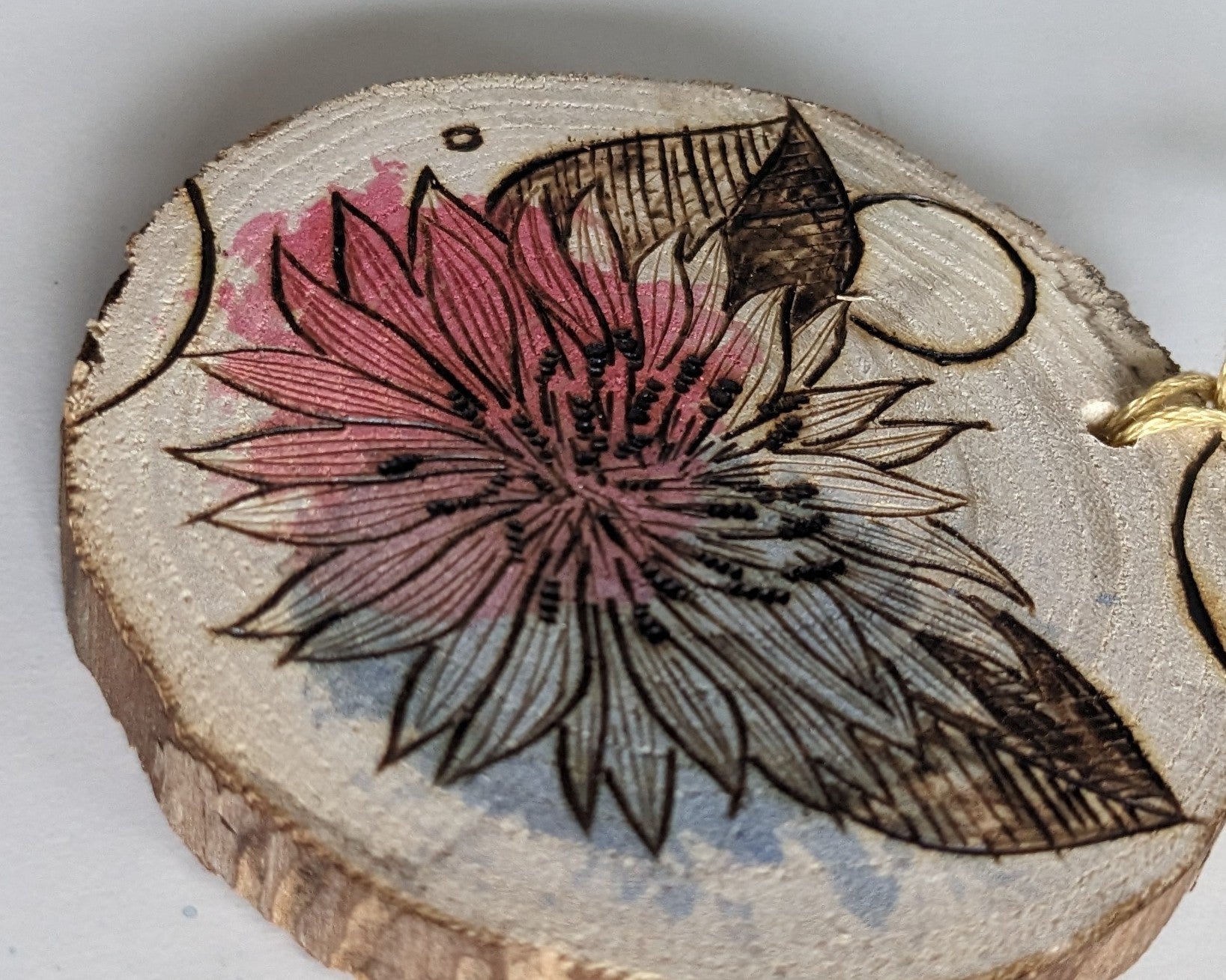 Watercolor and Woodburning on hand cut maple wood slice. About 3in diameter.