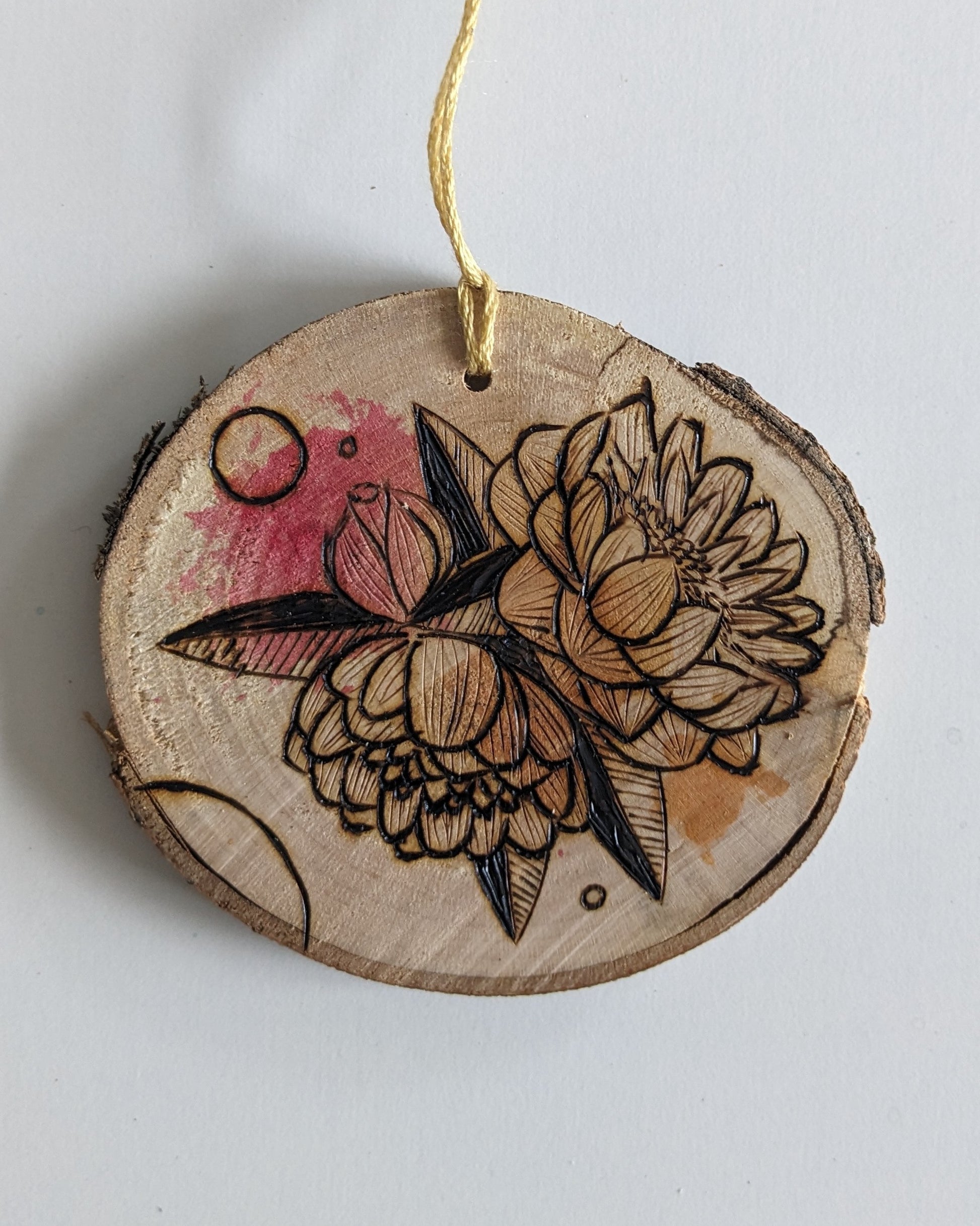 Watercolor and Woodburning on hand cut maple wood slice. About 3in diameter.