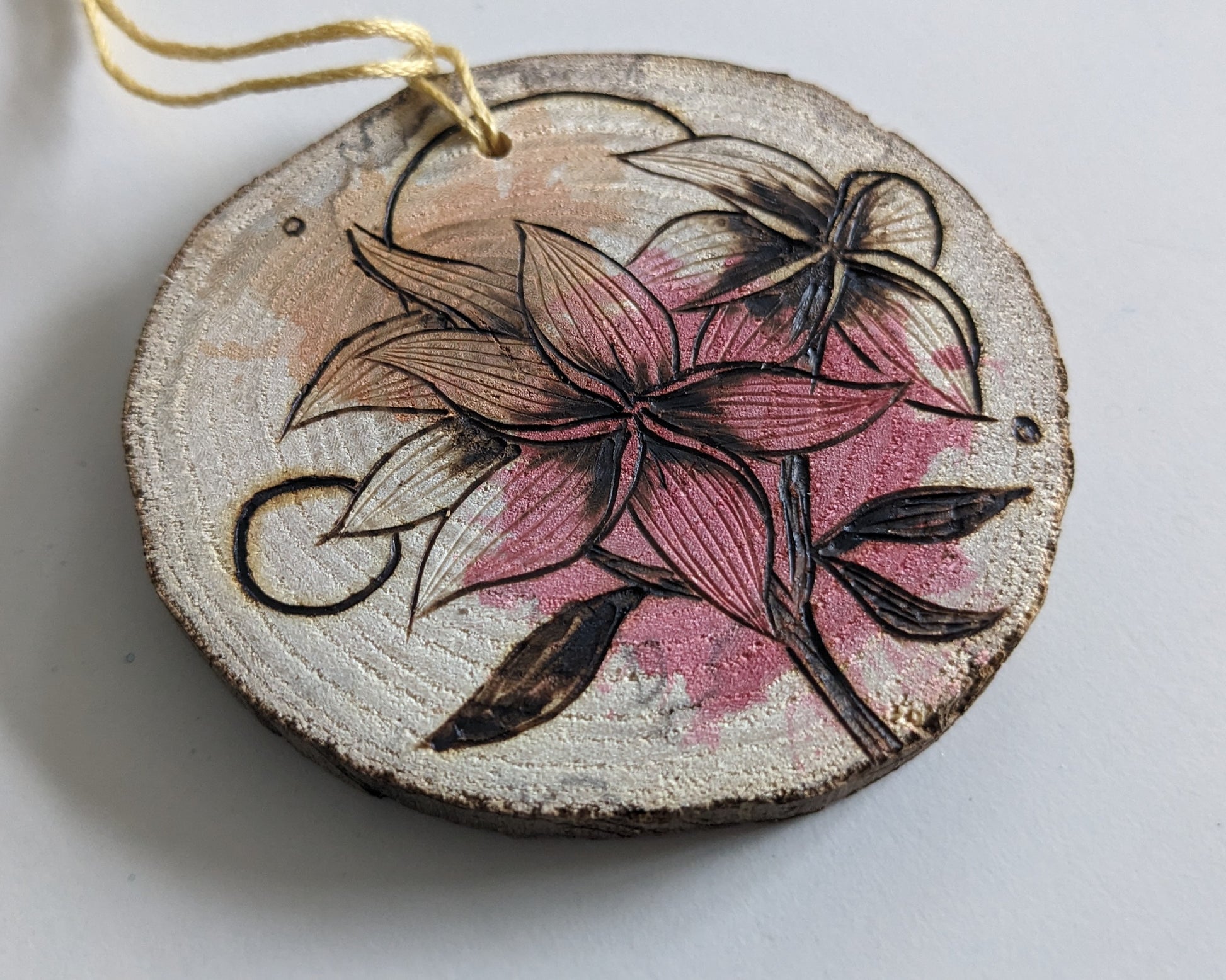 Watercolor and Woodburning on hand cut maple wood slice. About 3in diameter.