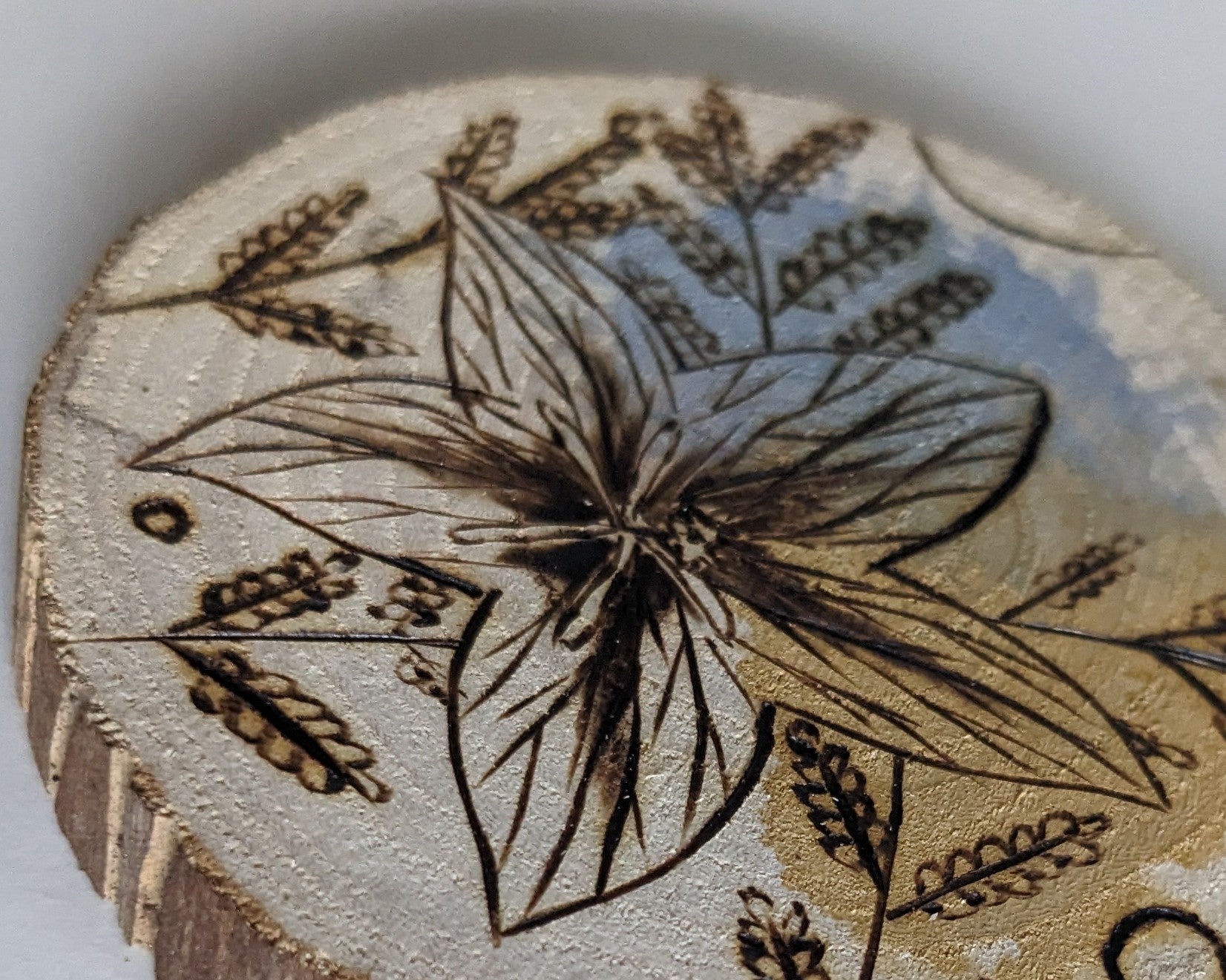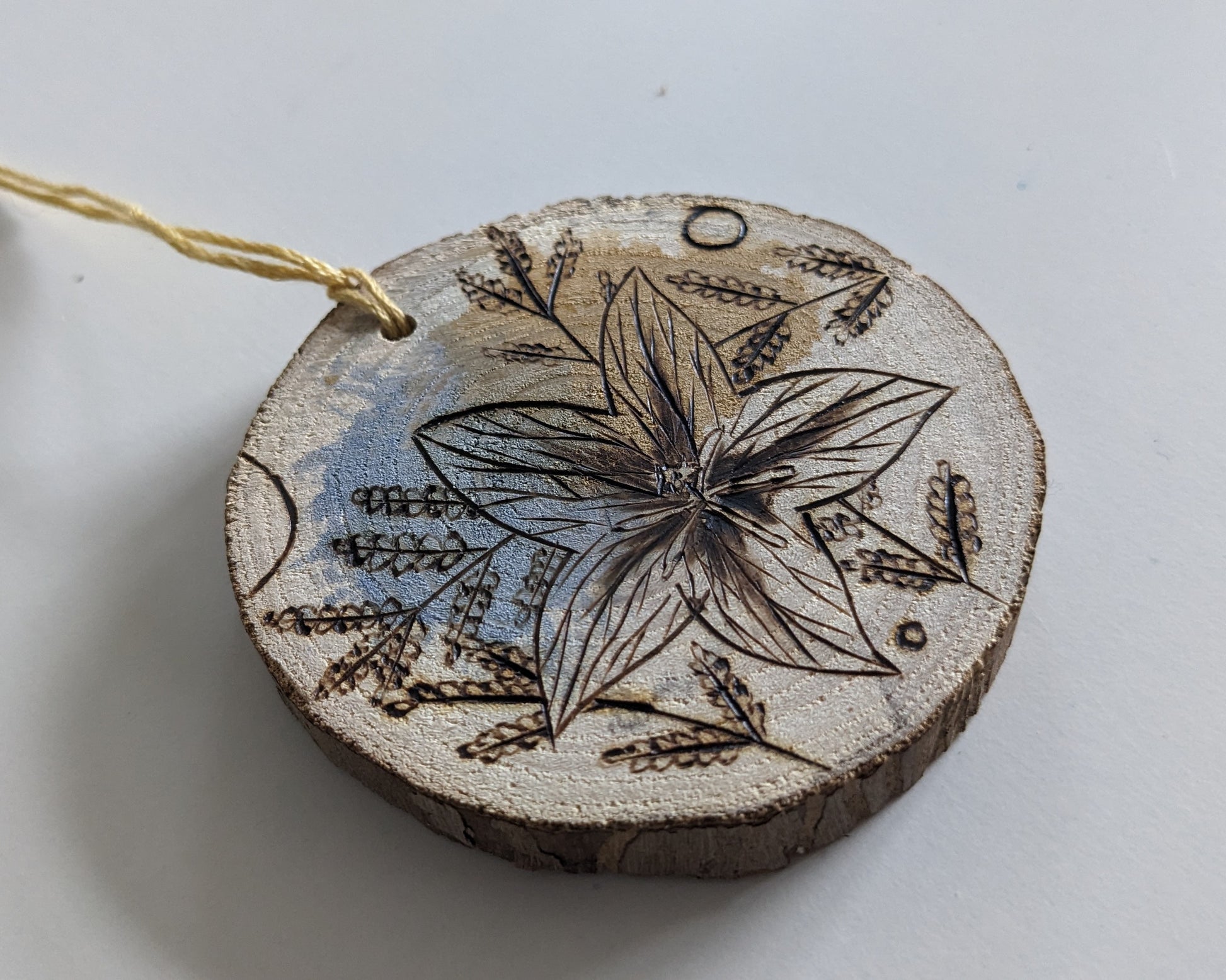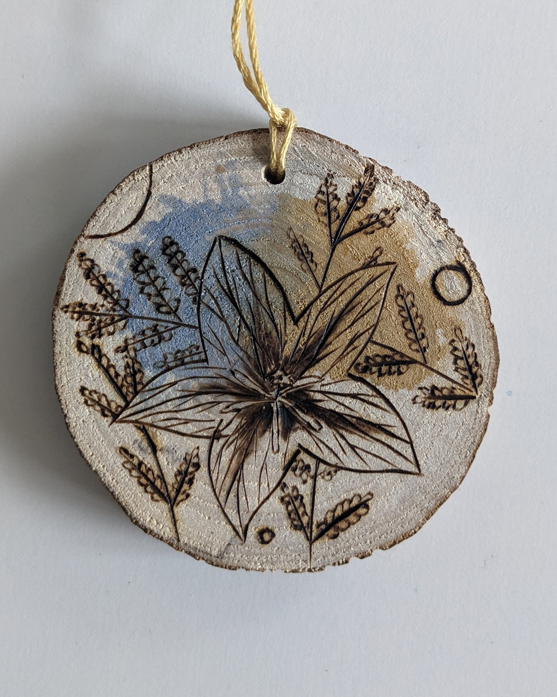 Watercolor and Woodburning on hand cut maple wood slice. About 3in diameter.