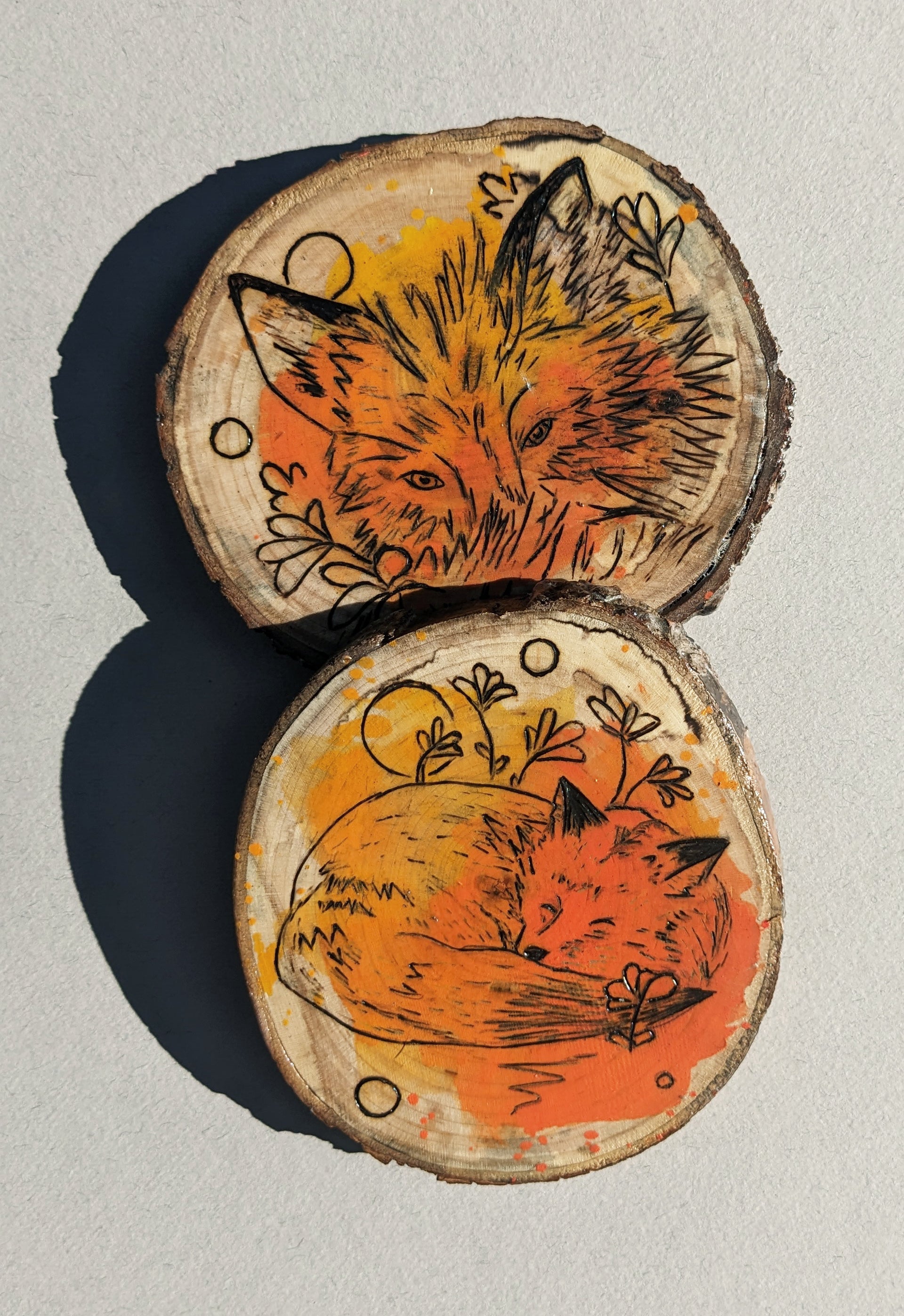 Set of 2 Hand painted with watercolor and woodburned coasters.