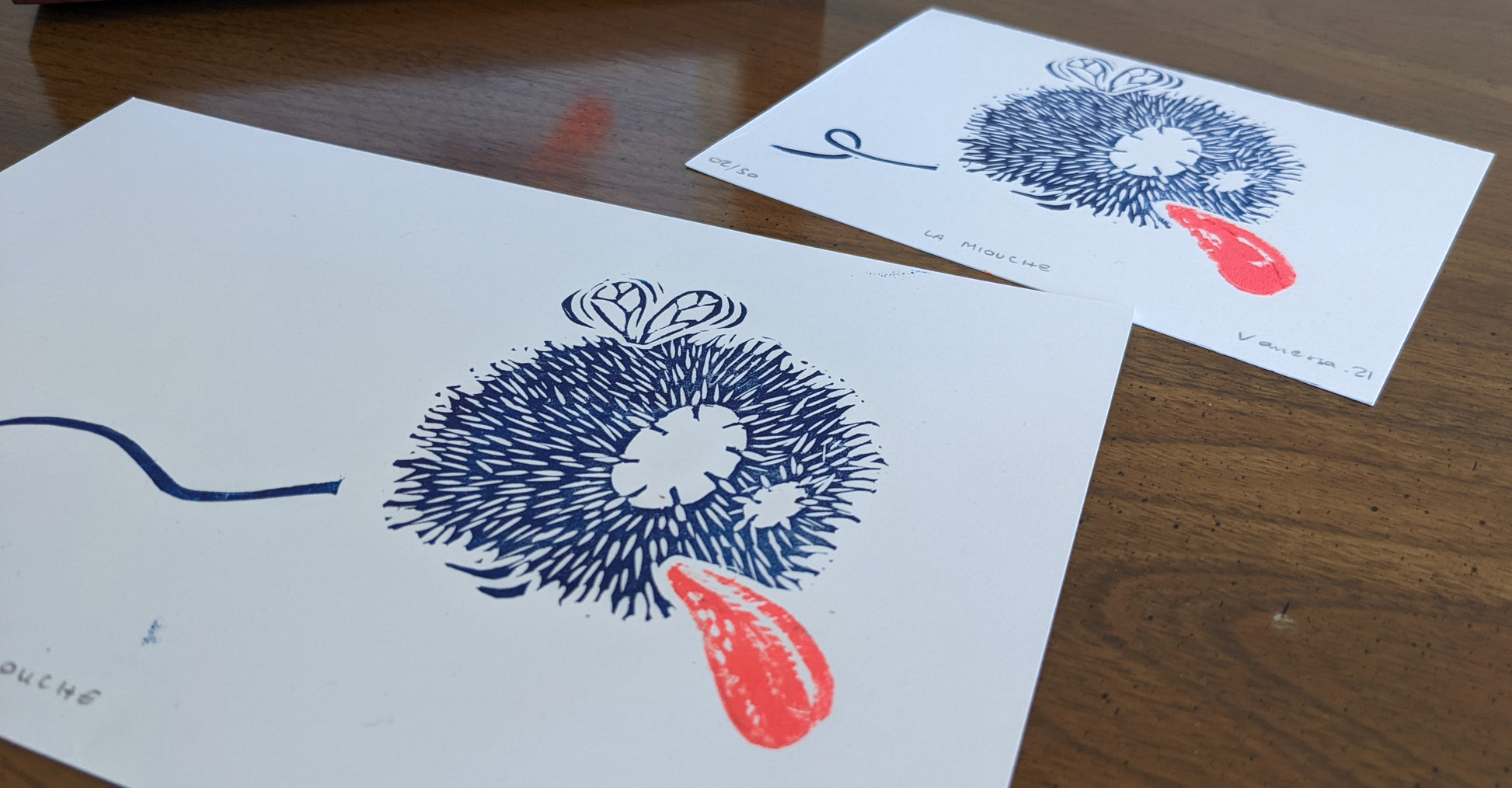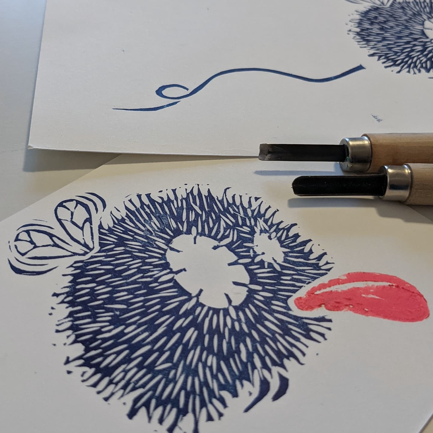 Hand printed linoprint on a approx 4 in white smooth 170g/m2 paper. Oil painting for the blue, water based for the pink.