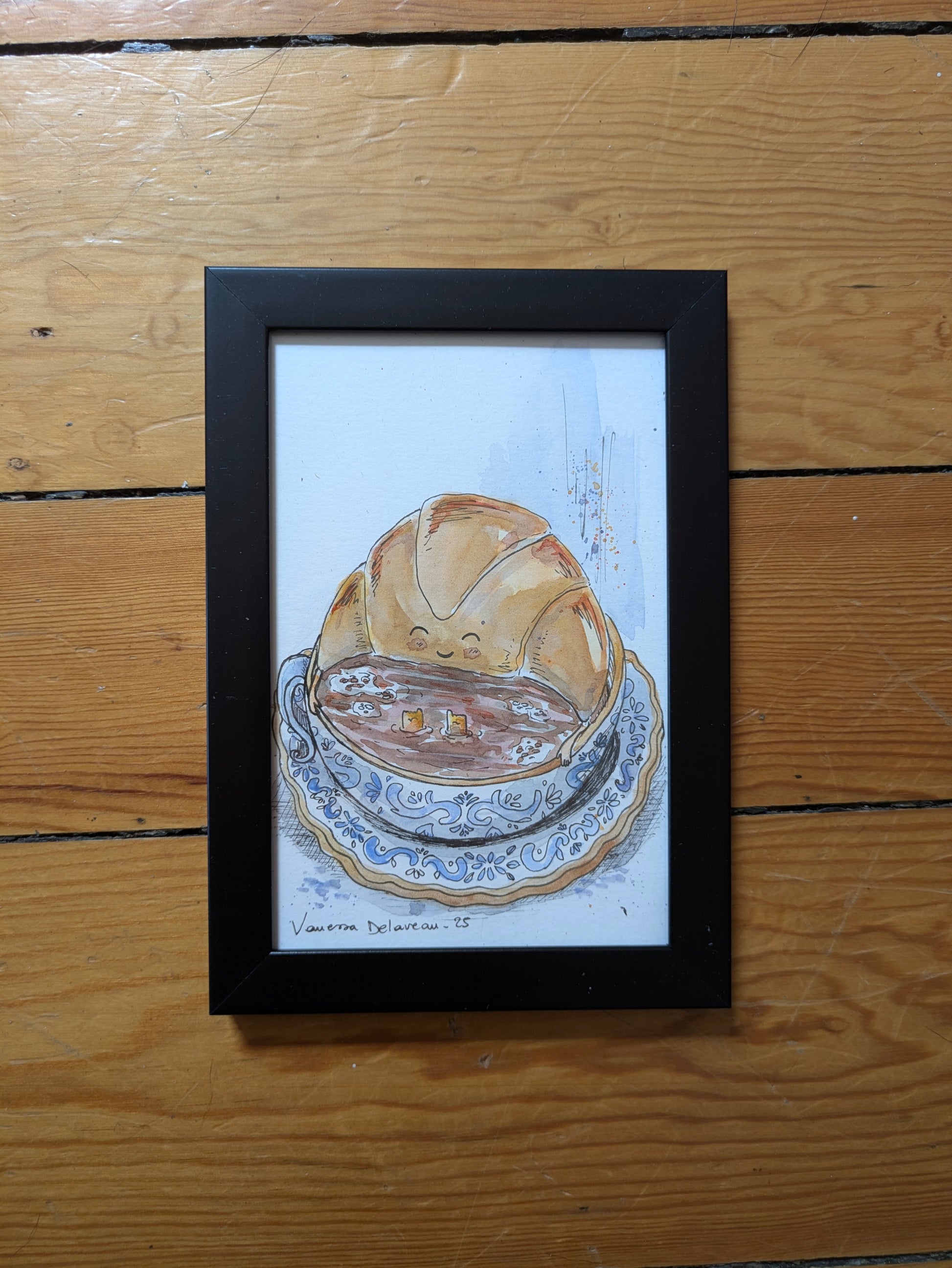 A fun illustration of a croissant taking a bath in a coffee