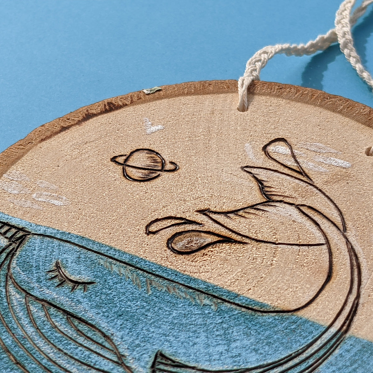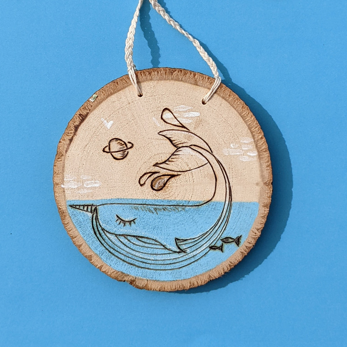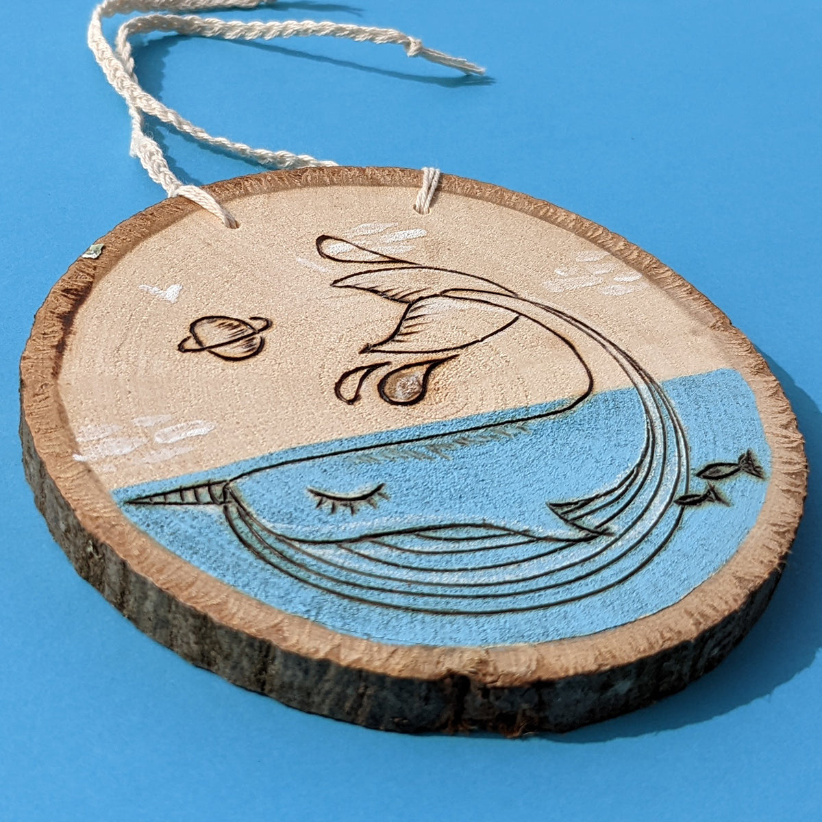 Painted and pyrographed hand cutted wood slice,