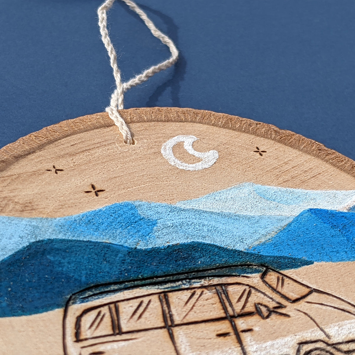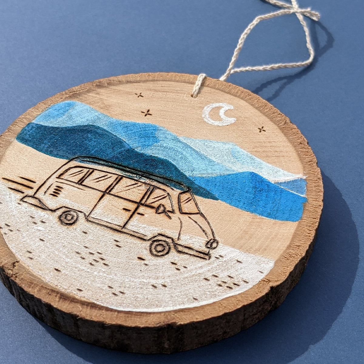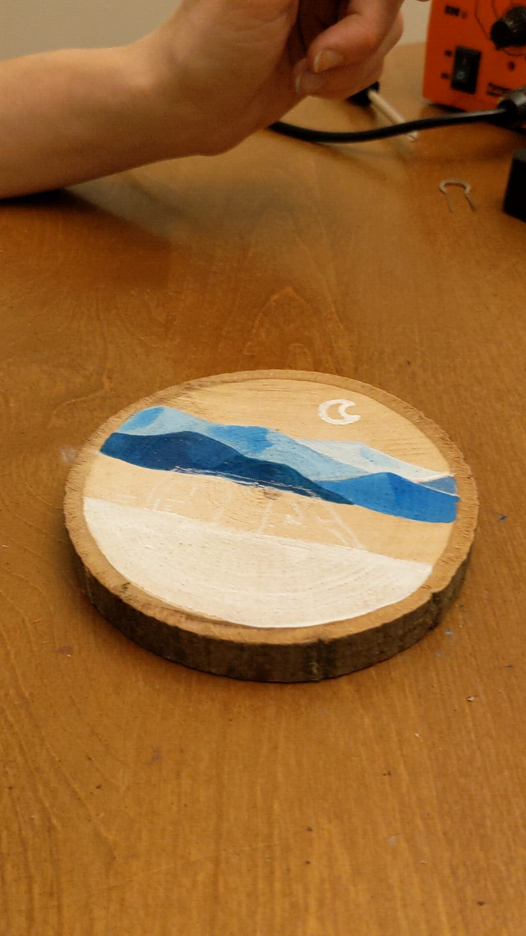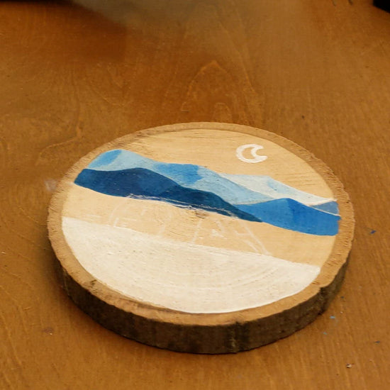 Painted and pyrographed hand cutted wood slice,